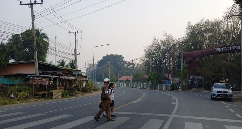 ด.ต.พิสูตร ไชชูโชติ ผบ.หมู่(ป.)สภ.ห้วยคต อำนวยความสะดวกจัดการจราจรเพื่อป้องกันอุบัติเหตุ บริเวณด้านหน้าทางเข้าโรงเรียนวัดสุวรรณบรรพต