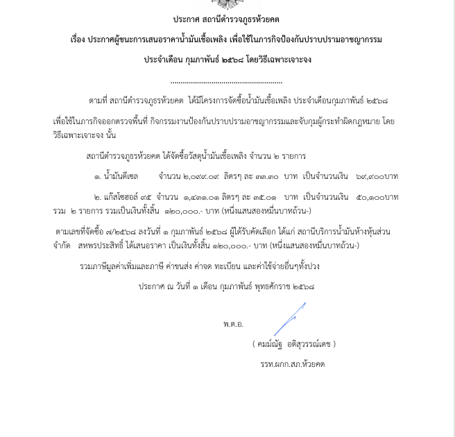 ประกาศผู้ชนะการเสนอราคาน้ำมันเชื้อเพลิง เพื่อใช้ในภารกิจป้องกันปราบปรามอาชญากรรมประจำเดือน กุมภาพันธ์ 2568 โดยวิธีเฉพาะเจาะจง