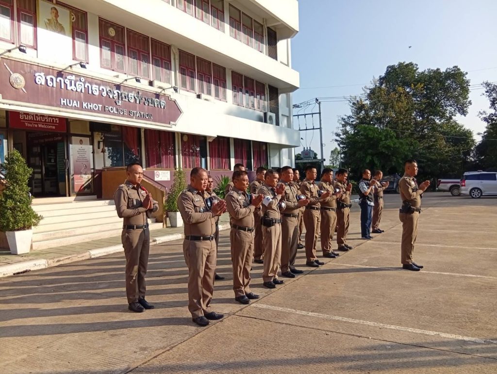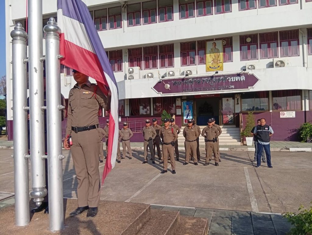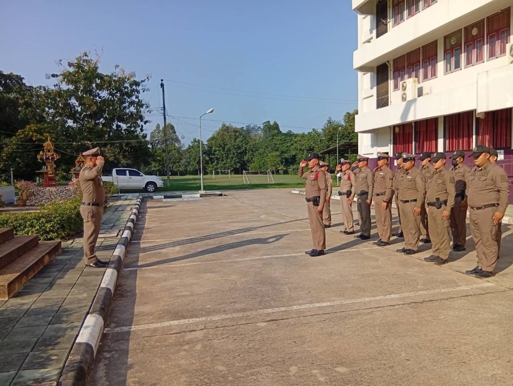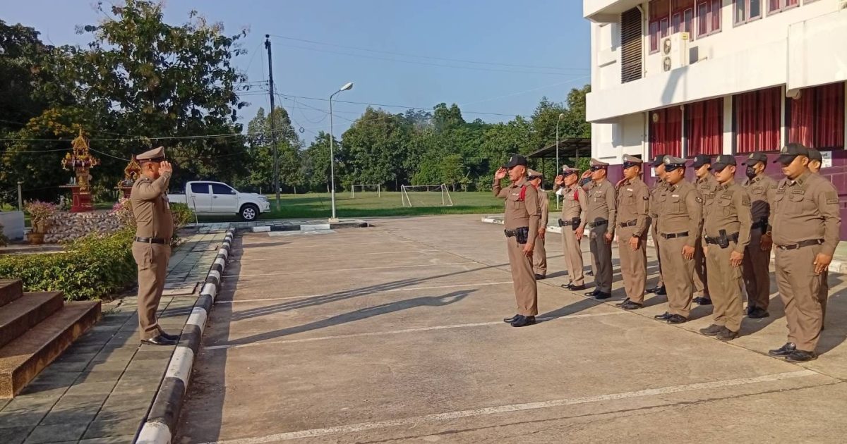 พ.ต.ท.ปพน โสพัฒน์ รอง ผกก.ป.สภ.ห้วยคต นำข้าราชการตำรวจเคารพธงชาติ ชี้แจงมอบหมายภารกิจ ตรวจอุปกรณ์เครื่องแต่งกายเเละทรงผม ปฏิบัติหน้าที่ด้วยความไม่ประมาท ปฏิบัติหน้าที่ตามนโยบายและคำสั่งของผู้บังคับบัญชาโดยเคร่งครัด